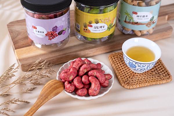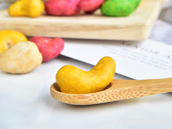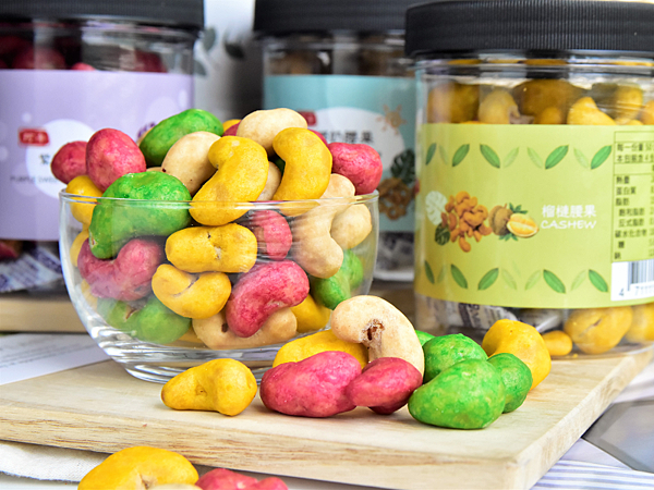 再來要跟大家分享的是紫薯腰果!紅紫色的外衣看起來分外喜氣,小嚐幾粒也是甜香可口、難以忘懷,相較鳳梨的香甜,紫薯腰果更清甜許多~留於嘴中的甜蜜值得大家細細品嚐。